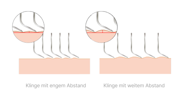 Näher zusammenliegende Klingen für eine glattere RasurDank unserer Klingen, die in einem Winkel geformt werden, können wir sie sehr nah beieinander positionieren. Der Grund für diese Technik ist einfach: Je enger die Abstände zwischen den Klingen, desto weniger dringt die Haut durch sie hindurch. So genießen Sie eine sicherere, glattere Rasur mit weniger Hautirritationen. Klinge mit engem Abstand / Klinge mit weitem AbstandOur Blades Are Different