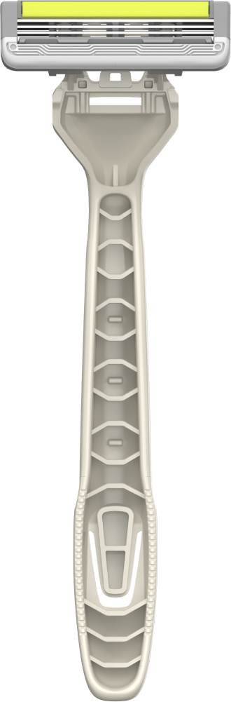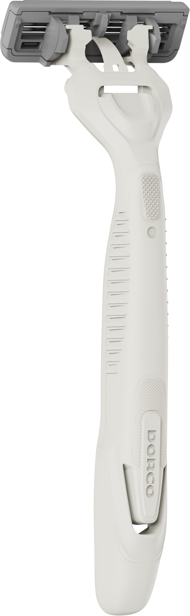 Tragbarer Rasierer, hergestellt mit PCR (Post-Consumer Recycled) Plastik.